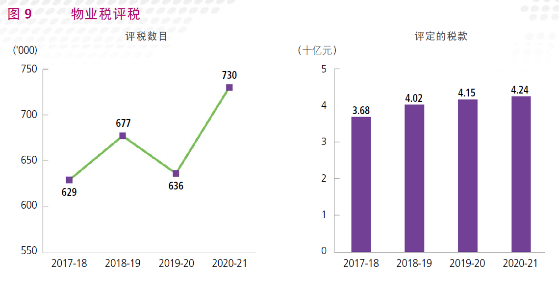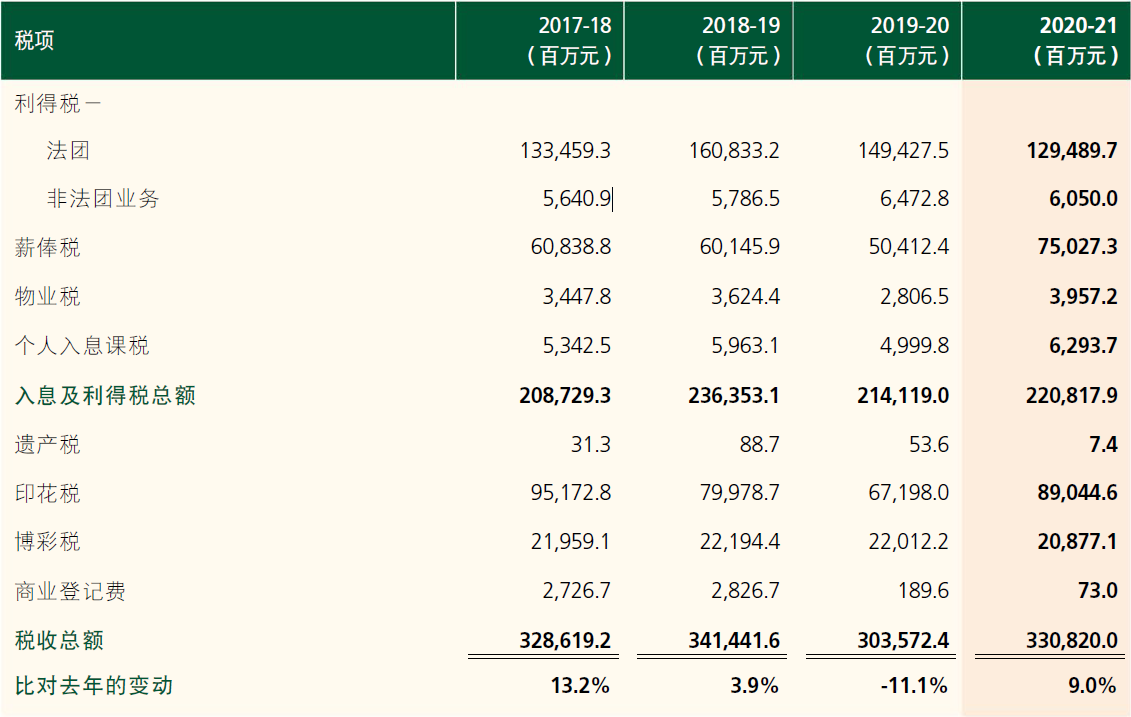 2020-21年度的薪俸稅評(píng)稅數(shù)目較上年度增加14.8%,但由于失業(yè)率上升以致應(yīng)課稅入息減少,令年內(nèi)評(píng)定的稅款較上年度減少了1.3%。