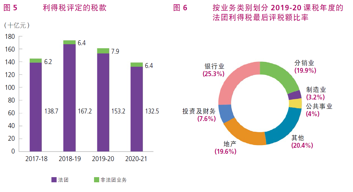 個(gè)人、法團(tuán)、團(tuán)體和合伙賺取在香港產(chǎn)生或得自香港的應(yīng)評(píng)稅利潤(rùn),須課繳利得稅。2019-20課稅年度利得稅兩級(jí)制稅率維持不變,法團(tuán)及非法團(tuán)業(yè)務(wù)首200萬(wàn)元應(yīng)評(píng)稅利潤(rùn)的利得稅稅率分別為8.25%及7.5%,其后的利潤(rùn)則按16.5%及15%徵稅。兩個(gè)或以上的有關(guān)連實(shí)體當(dāng)中,只有一個(gè)可選擇兩級(jí)制利得稅率。在2020-21年度評(píng)定的利得稅稅款為1,389億元,較上年度減少222億元。